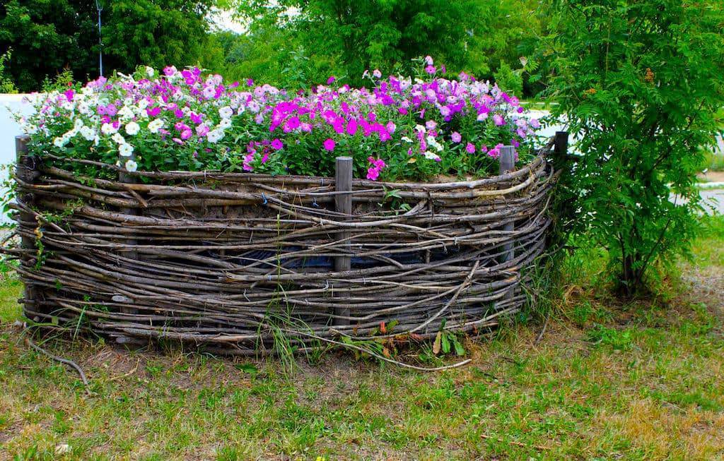Вооружаемся острым ножом и отправляемся заготавливать прутья. Подойдет ивняк, орешник, сирень и даже ветки обычных плодовых деревьев. Брать нужно однолетние ветви. Собранное сырье замачиваем в воду. Это нужно для придания ветвям хорошей гибкости. В воде оставляем их на сутки. За это время забиваем в землю опорные столбики, предварительно обработав их антисептиком. Защита продлит срок их службы. Плести вокруг них лозу можно горизонтальным способом и вертикальным. Последний вариант более приемлем для ограждений от улиц, внутри двора эстетичнее смотрится горизонтально сплетенный забор. Он будет отличным способом отгородить территорию детской площадки или хозчасти.