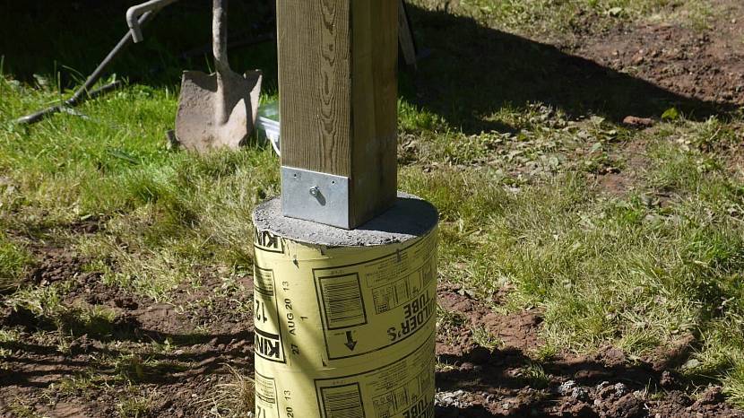 - Устанавливают опорные столбы, бетонируют. В раствор лучше добавить гравий средней фракции. Дают время, чтобы раствор схватился, от 5 до 7 дней.