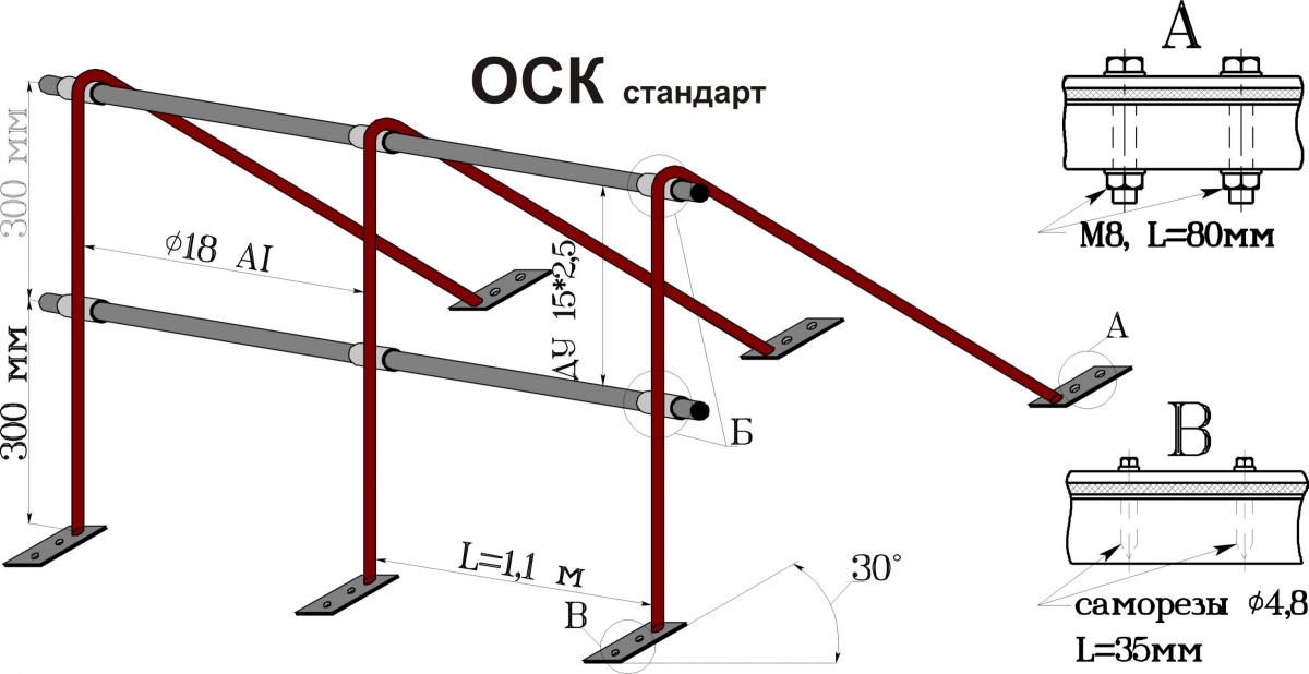Расположенные по горизонтали элементы такого кровельного ограждения не должны располагаться между собой на расстоянии более 30 сантиметров.