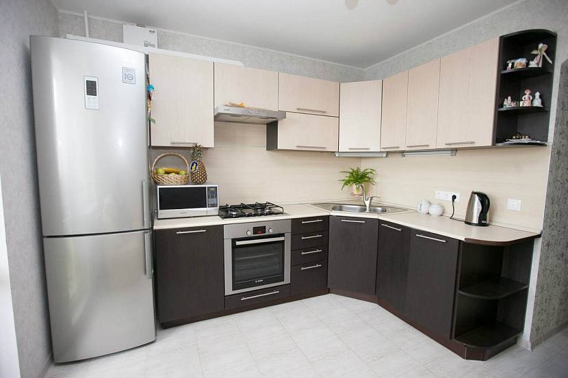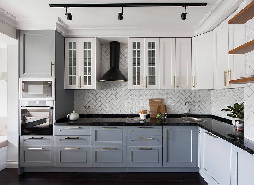 При выборе оттенков также обращают внимание на цвета отделочных материалов стен, пола и потолка. Чтобы усложнить дизайн фасада, используют дополнительные цвета для столешницы и фартука, выбирают стеклянные фасады и устанавливают контрастные бытовые приборы
