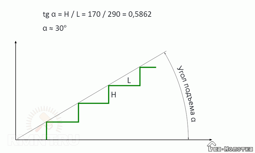 Зависимость высоты и ширины ступени от угла подъема лестницы