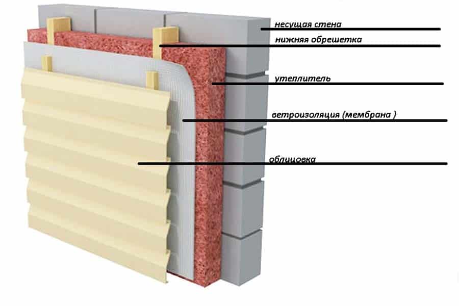 - на стену набивается каркас с расстоянием между вертикальными стойками равным ширине плит. Горизонтальные рейки крепятся в интервале, кратном длине утеплительных матов. Ширина бруса должна быть чуть больше толщины утеплительных матов — таким образом формируется небольшой вентиляционный зазор между теплоизоляционным слоем и облицовкой фасада;