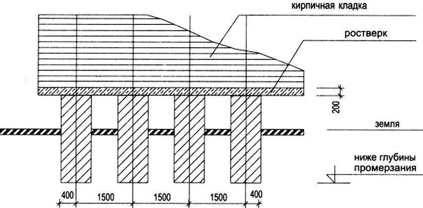 Название говорит само за себя. Основой фундамента являются столбы, которые заглубляются в грунт на расчётную глубину. По верхам столбов устанавливается бетонная или металлическая рама (так называемый ростверк).