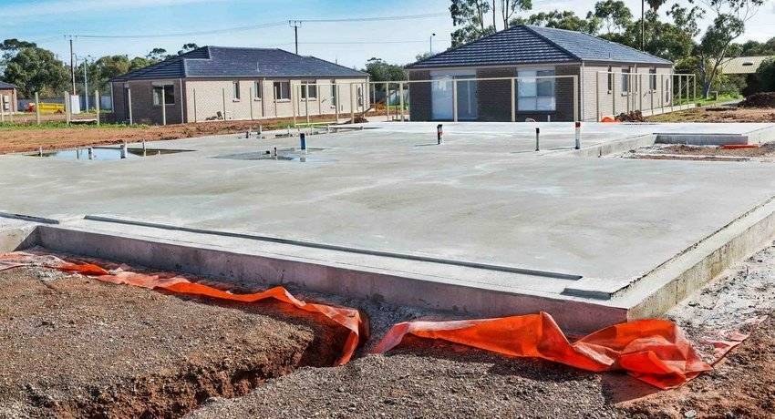 Толщина бетонной плиты варьируется от 150 до 350 мм в зависимости от типа грунта, глубины подземных вод и общей массы постройки.