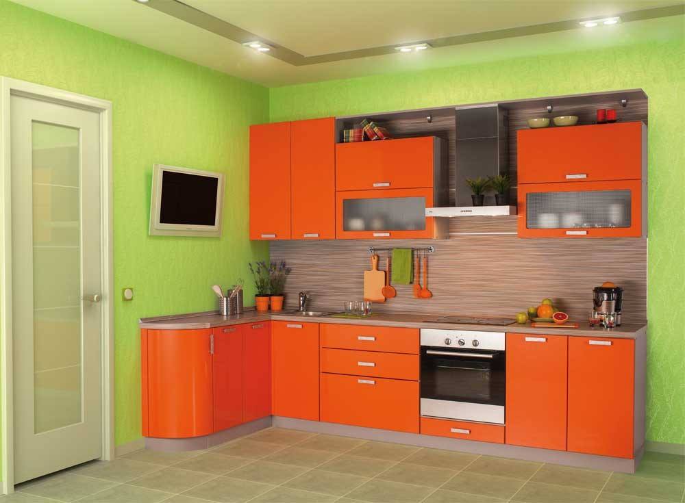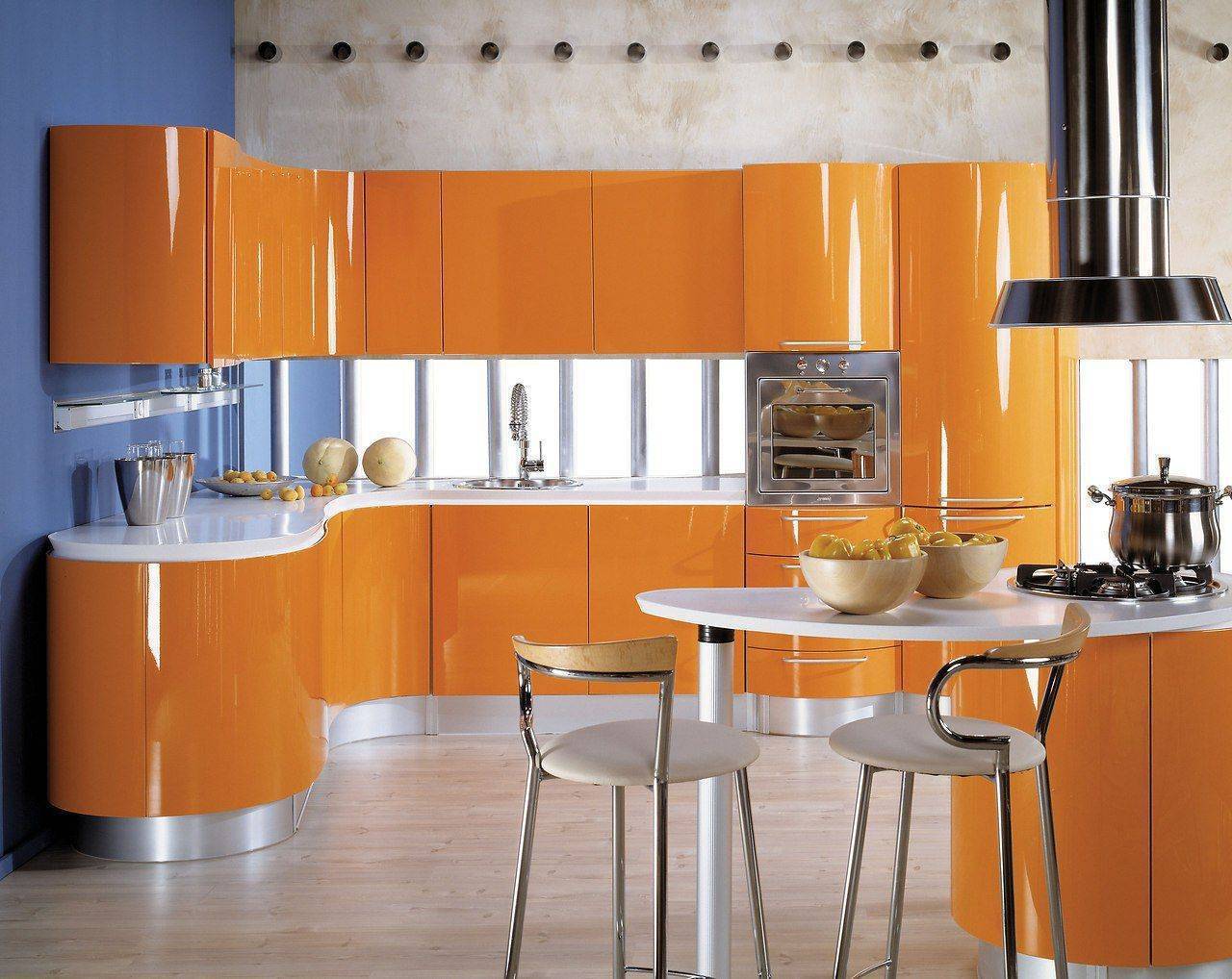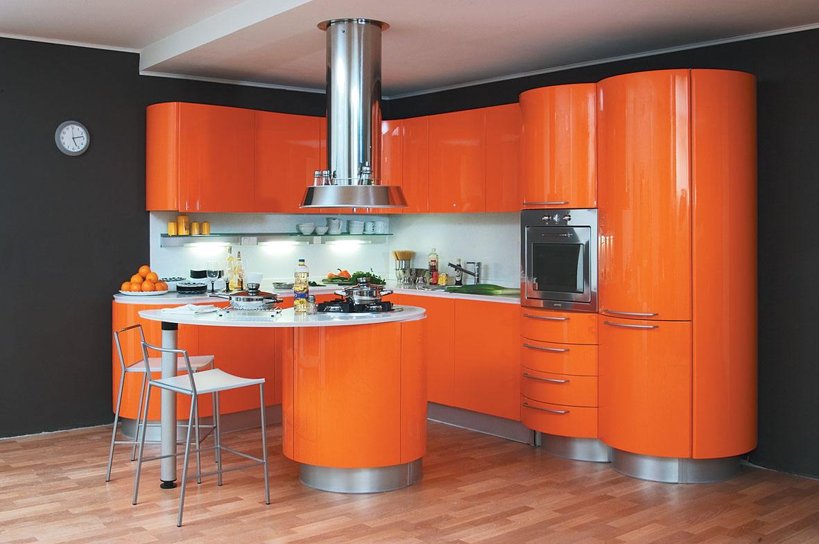 Цвет мебели в оранжевой кухне играет главную, ведущую роль