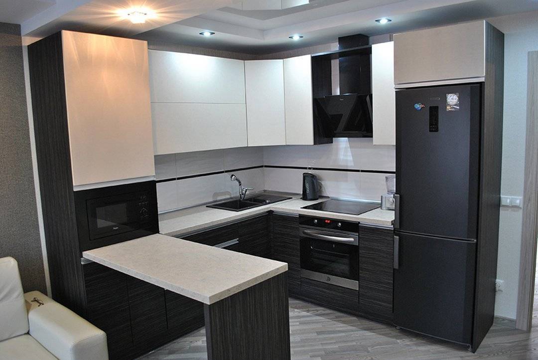 П-образный дизайн для маленькой кухни. Выразительно, объемно, функционально, но с одним большим минусом – для столовой не остается места. Мебель, техника занимают обе стены. Под окном располагается рабочая поверхность. Обеденную зону приходится выносить за пределы помещения.