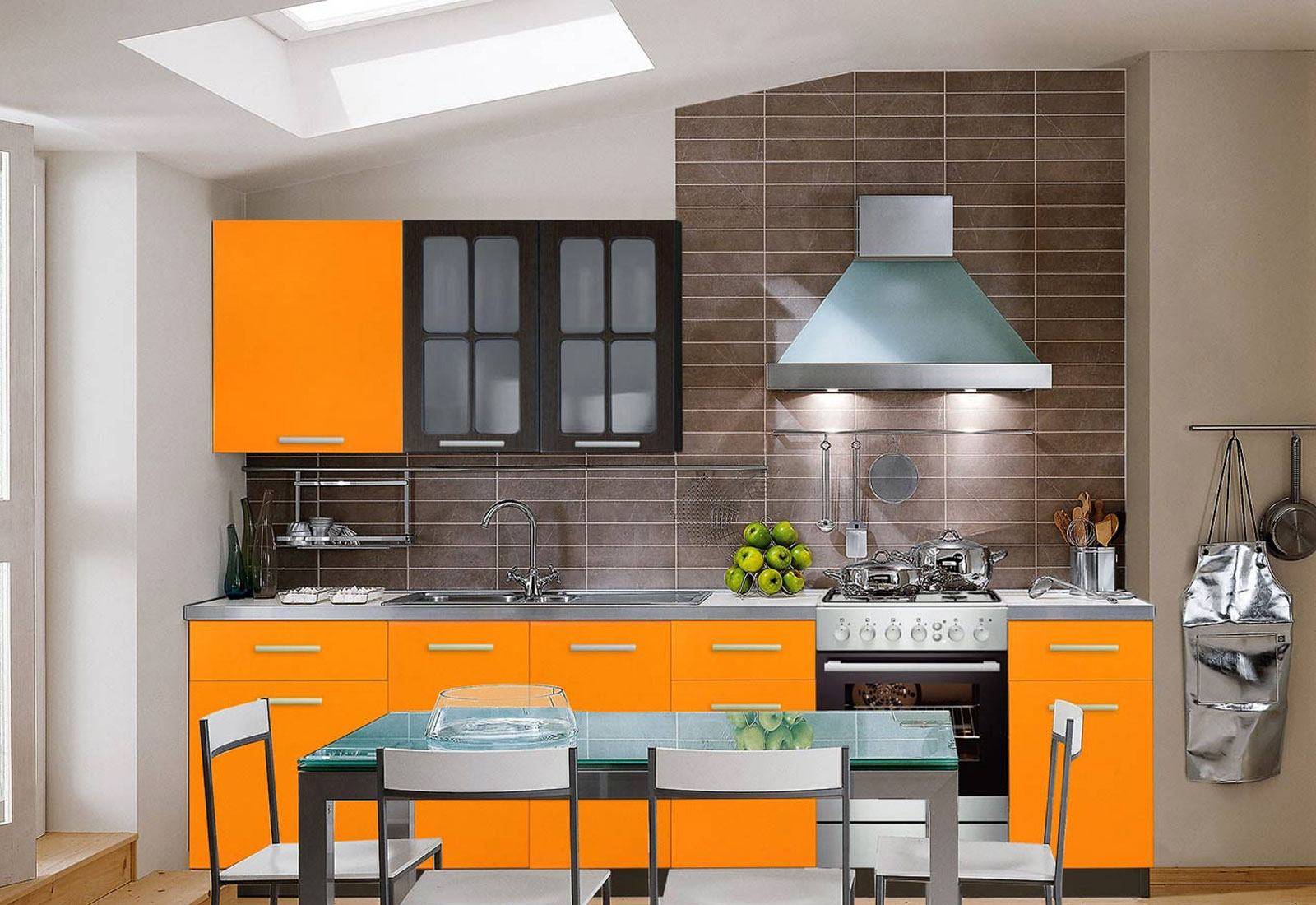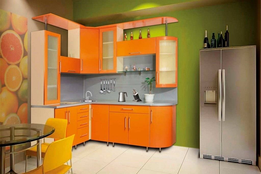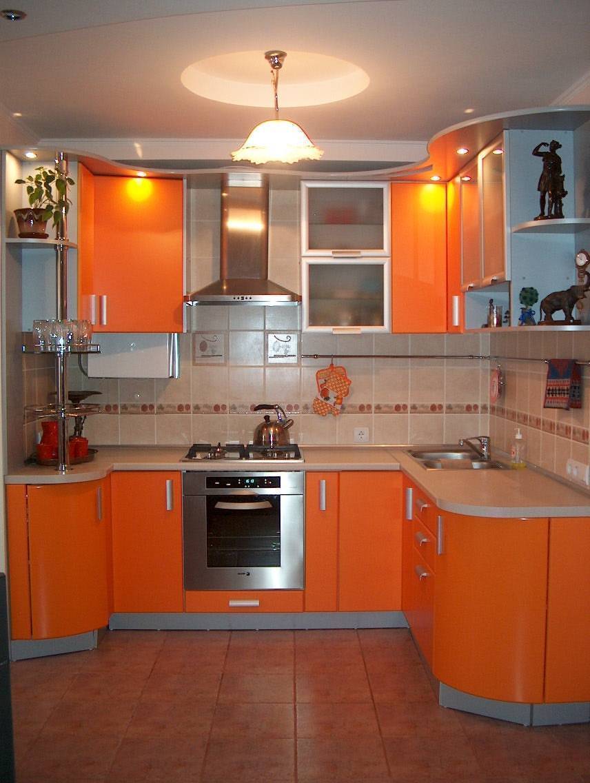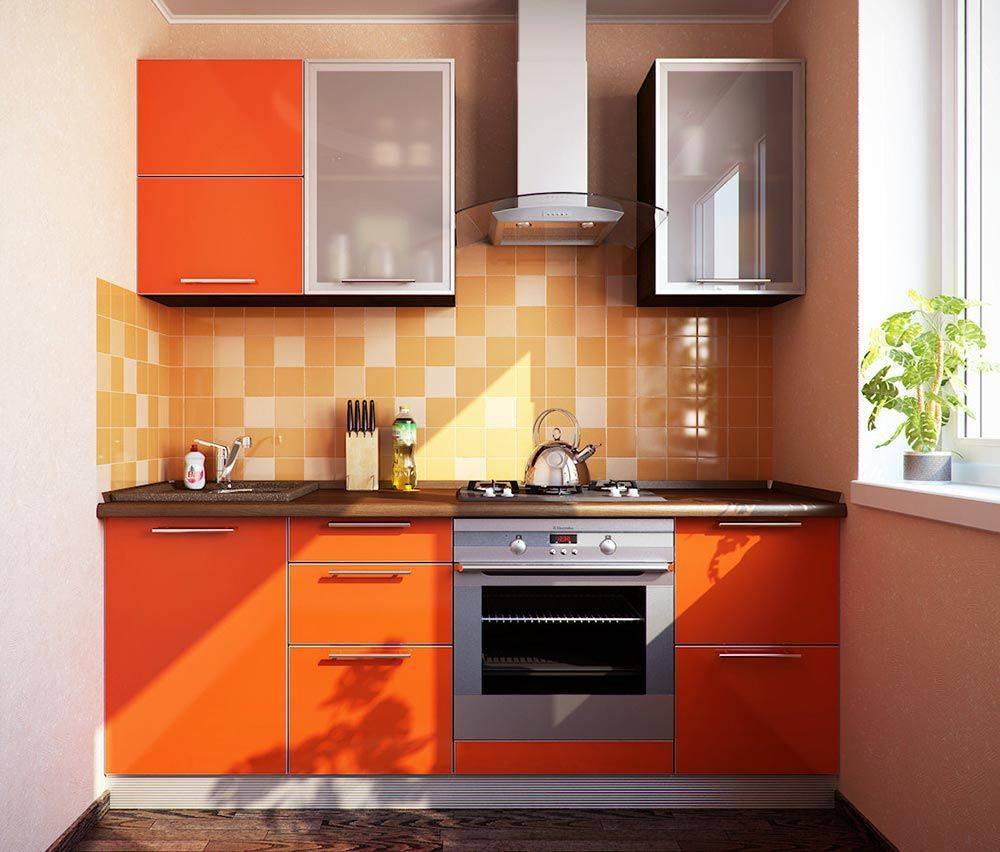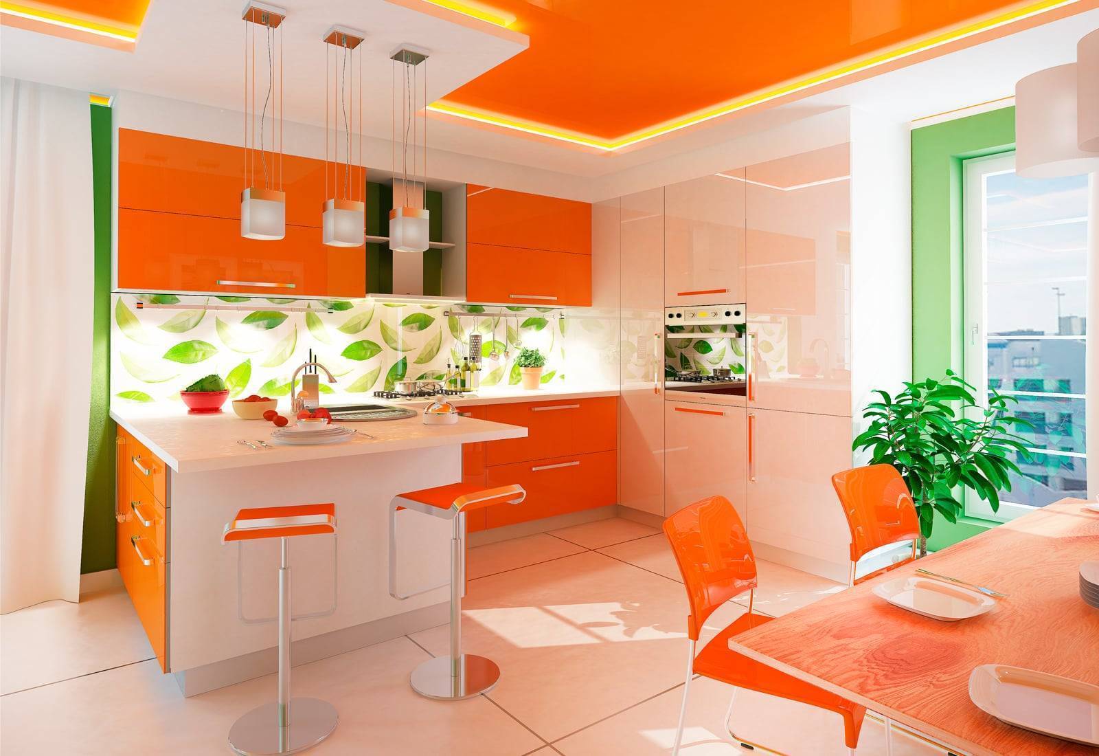 Яркая солнечная палитра красок способна визуально изменить восприятие предметов и помещения, приближая насыщенные элементы. Гарнитур с оранжевыми фасадами кажется ближе, чем он расположен на самом деле. Для зрительного увеличения помещения следует отдать предпочтение персиковым тонам