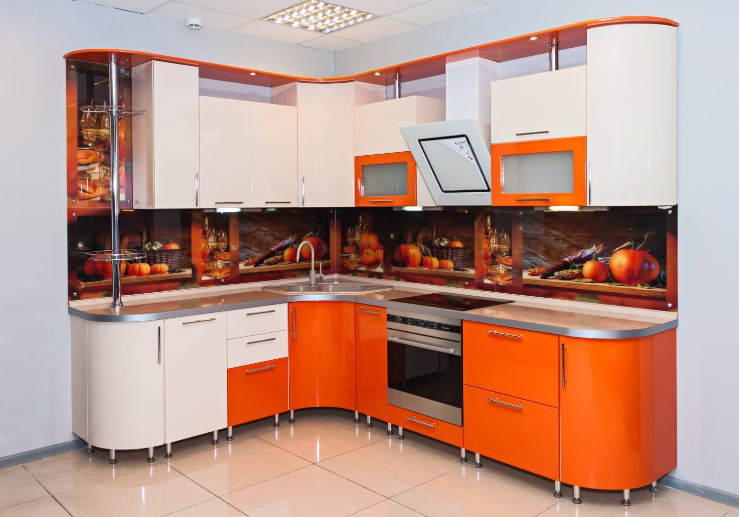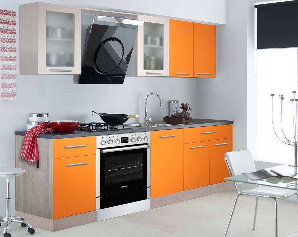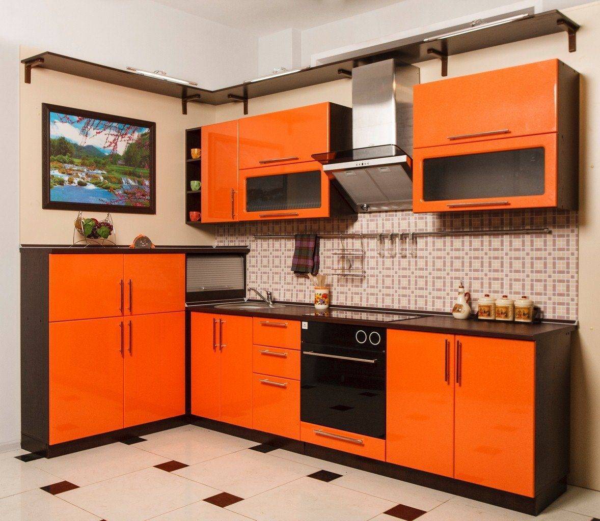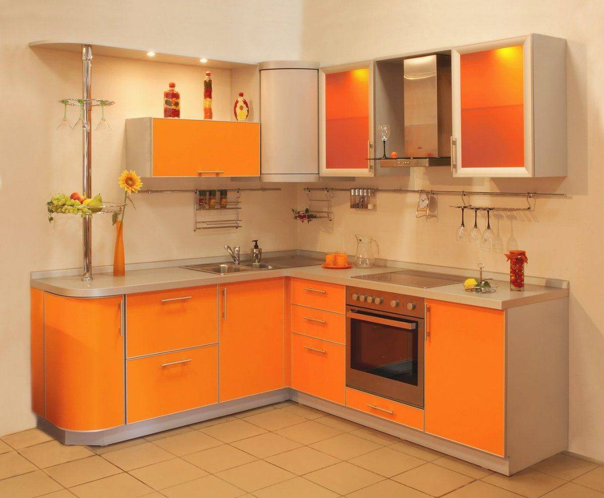 Яркая солнечная палитра красок способна визуально изменить восприятие предметов и помещения, приближая насыщенные элементы. Гарнитур с оранжевыми фасадами кажется ближе, чем он расположен на самом деле. Для зрительного увеличения помещения следует отдать предпочтение персиковым тонам