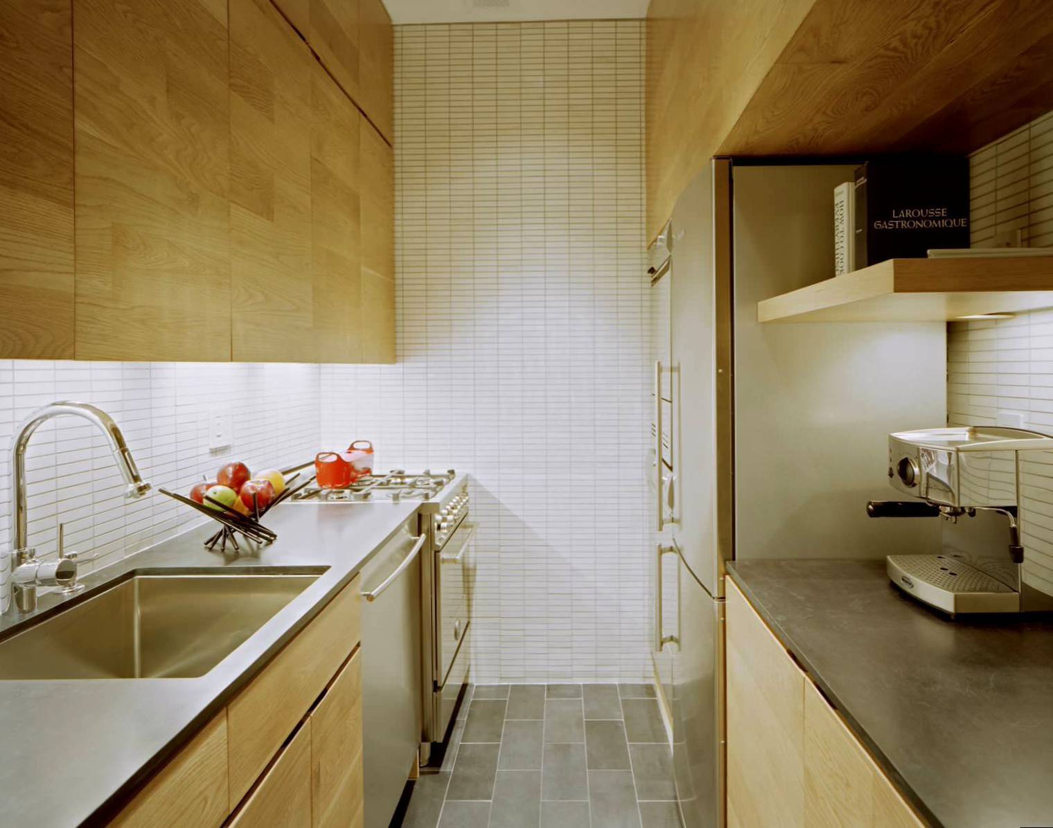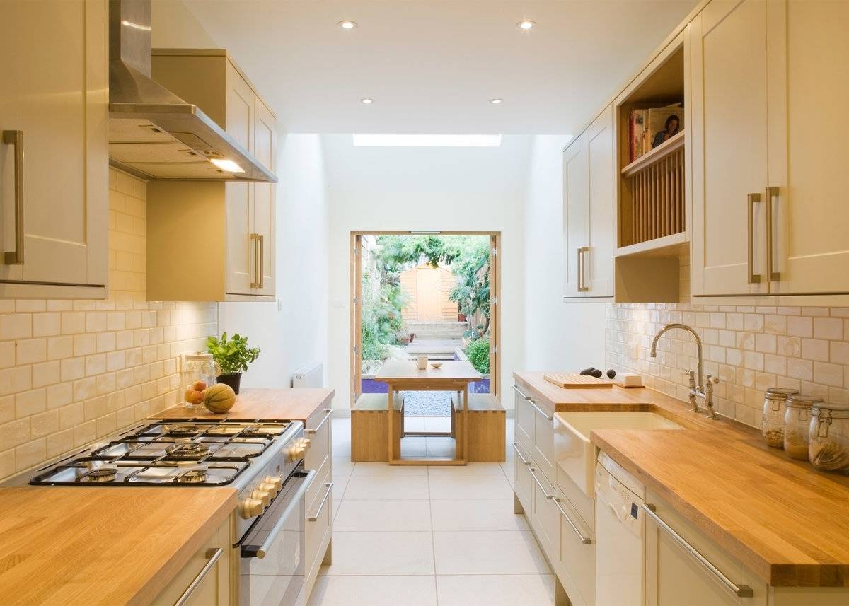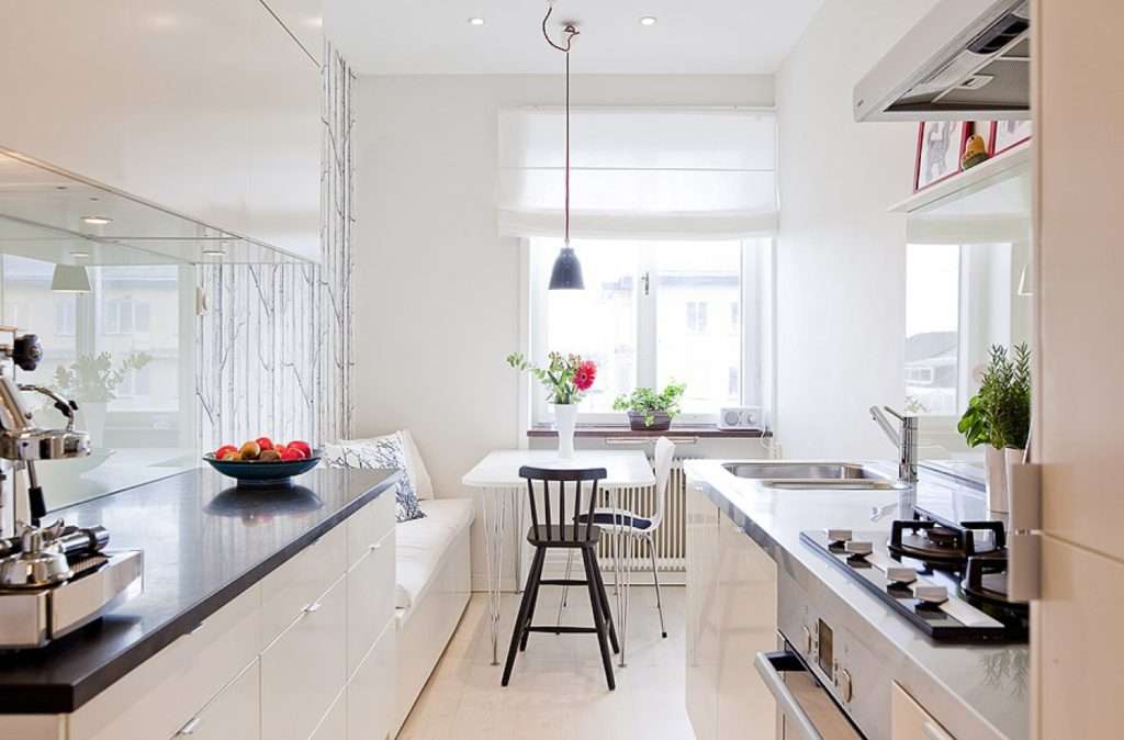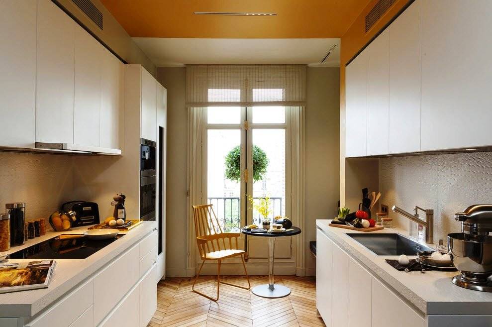 Параллельный (двухрядный). Если прямоугольная кухня имеет узкий проход, то лучше не использовать этот вариант. Ширина должна быть средней. Вдоль одной стены устанавливается гарнитур с плитой и раковиной. Для секции с продуктами, холодильника выбирается противоположная сторона. Обеденную группу перемещают к окну.