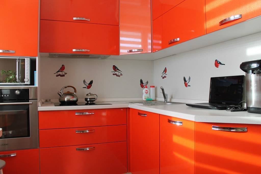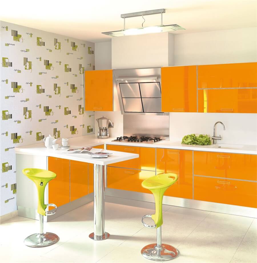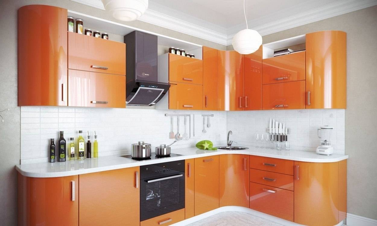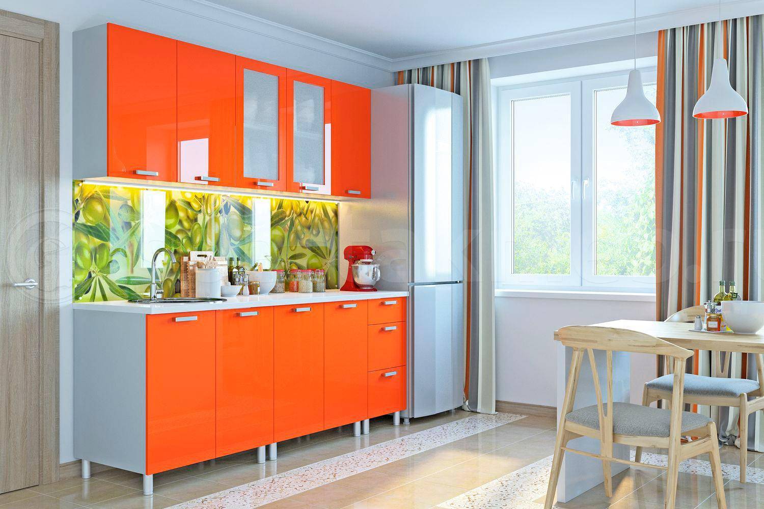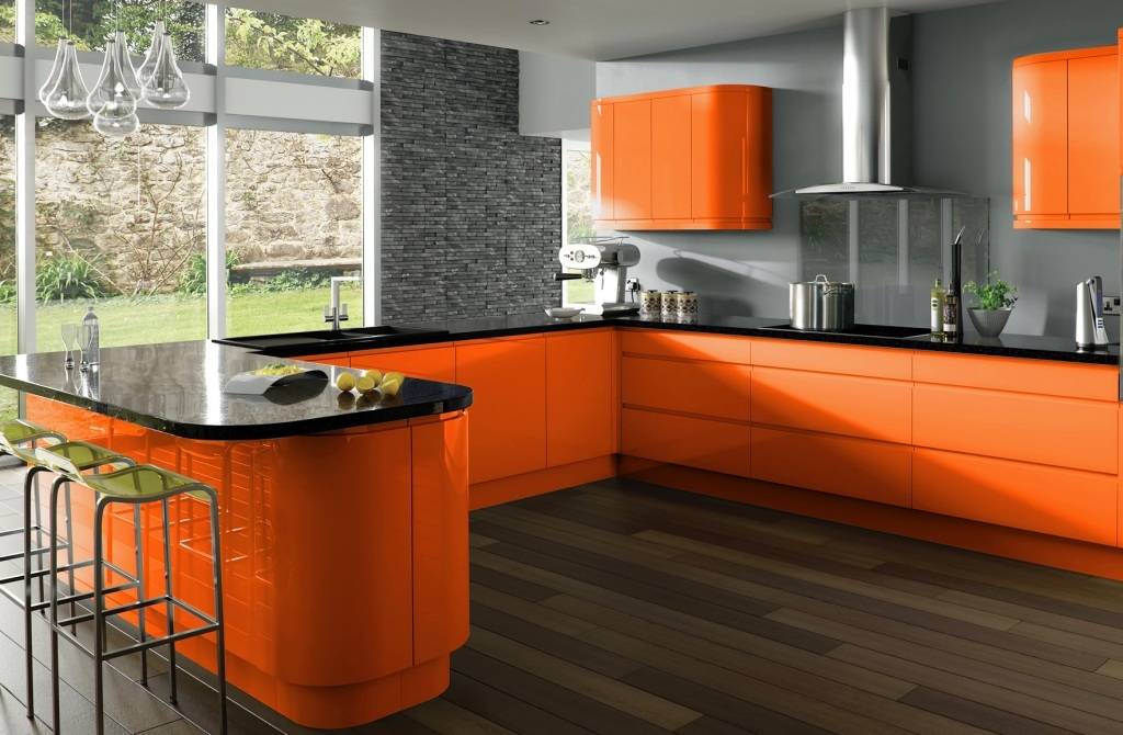Если вам нравится оранжевый цвет, но вы предпочитаете не красить стены в этот цвет, то можете выбрать решение в виде яркой кухонной мебели. Здесь будут белоснежные стены, потолок, напольная плитка и шторы, которые сочетались с современными оранжевыми глянцевыми шкафами