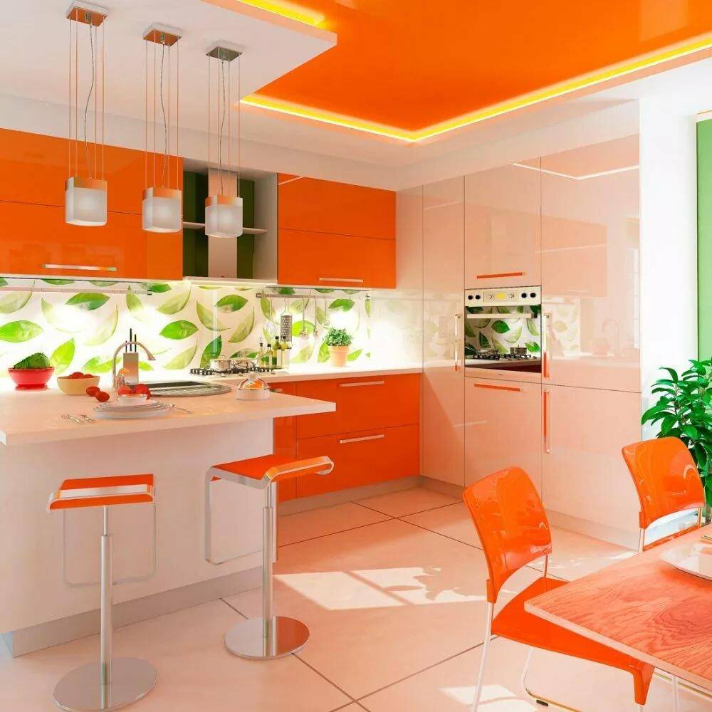 Оранжевый гарнитур на кухне требует, чтобы остальная отделка была более спокойных, нейтральных тонов. Для потолка, стен останавливают выбор на молочном, кремовом, жемчужном, бежевом, ванильном оттенках. Напольное покрытие хорошо смотрится в интерьере, если будет на пару тонов темнее потолка и стен.