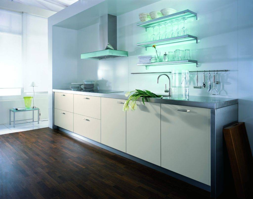 Можно поставить мебель в одну линию. Но тогда акцент делается на материалах гарнитура и оформлении стен, потолков, иначе общая картина будет смотреться безлико, скучно. Обеденная зона размещается на противоположной стороне или в углу.