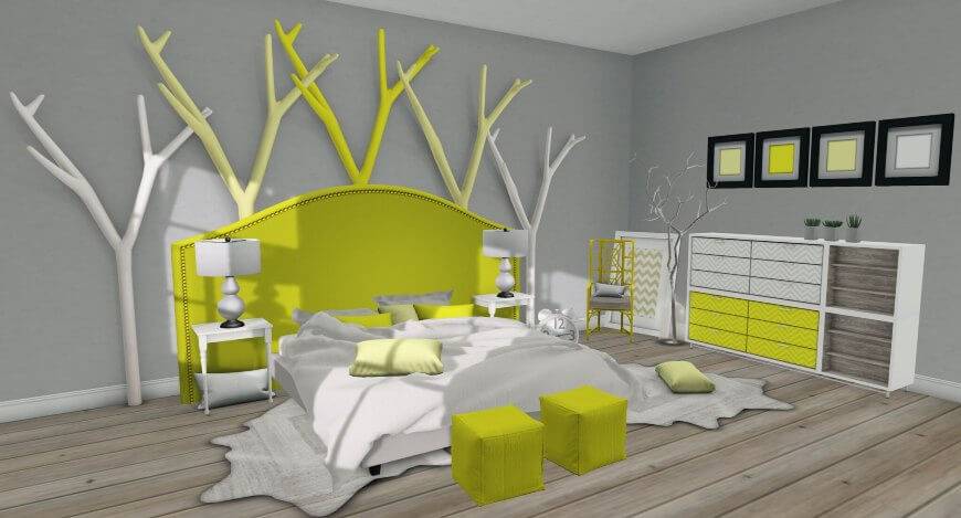 Желто-салатовый интерьер спальни.