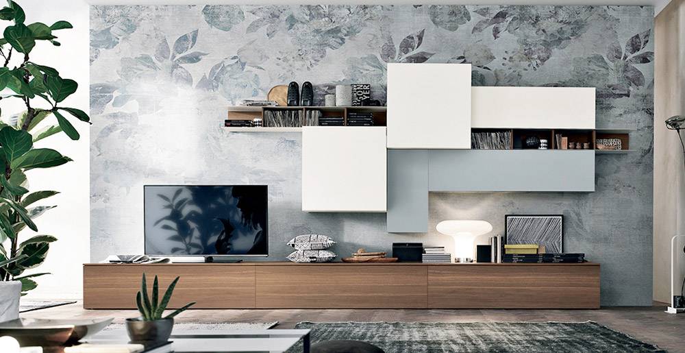 Оформление гостиной в современном стиле можно назвать полной противоположностью предыдущему примеру. В этом дизайне главенствуют простота, сдержанность, ненатуральные материалы и чёткие графические линии. На первый взгляд такое помещение немного напоминает офис, поэтому для создания более уютной обстановки следует дополнить современную технику и трансформирующуюся мебель ковровым покрытием и мягкими подушками.