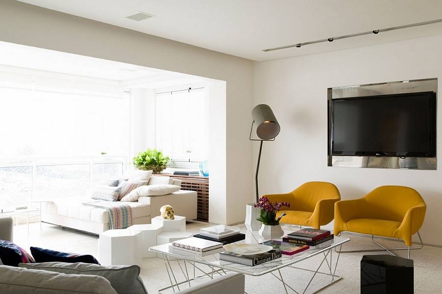 Оранжевый, красный, желтый и даже голубой гармонично впишутся в интерьер вашей гостиной в современном стиле, если основной декор стен выдержан в ахроматическом цвете: белом или черном