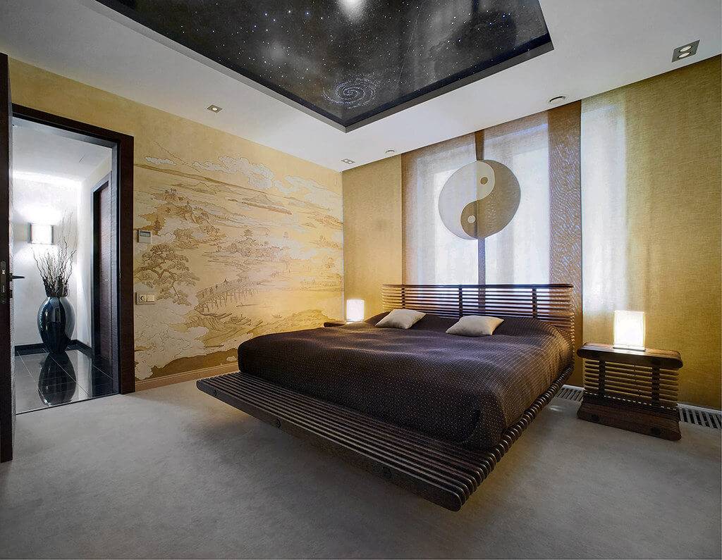 Обустройство кровати на платформе позаимствовано из дизайна в азиатском стиле, но отличается более свободными чертами, которые могут проявляться в небольшой лестнице, встроенными ящиками для хранения вещей или открытыми стеллажами с неяркой подсветкой. Такое решение смотрится креативно и весьма привлекательно.
