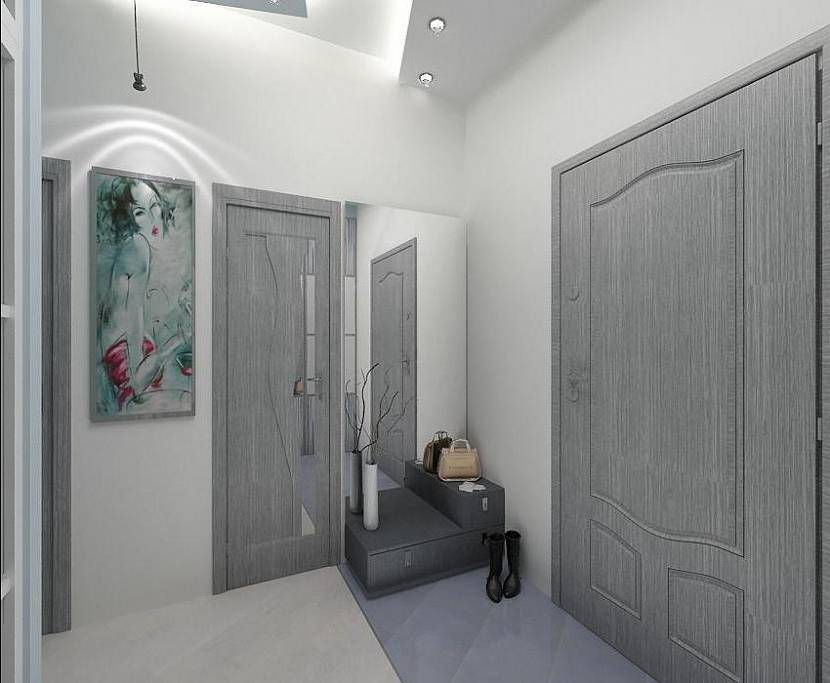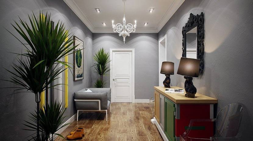 Поскольку в этом помещении практически всегда отсутствует естественное освещение, то следует установить яркие лампочки и большое зеркало. В коридоре могут быть серые стены, но остальные поверхности тогда должны отличаться оттенком или расцветкой. Нужен белый потолок и очень мало контрастных цветовых сочетаний.