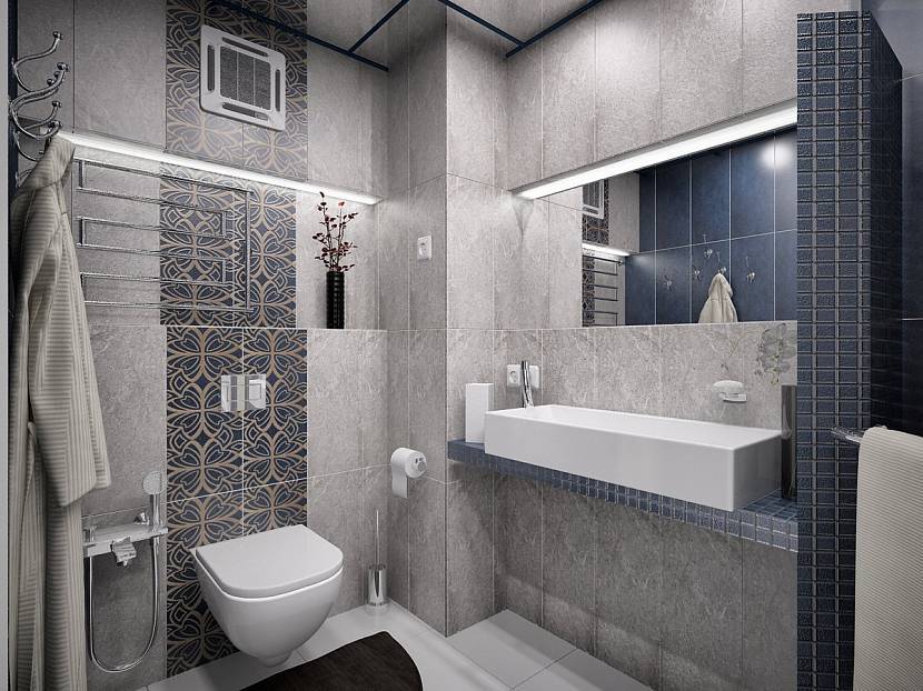 При сочетании серого с другими тонами отделка будет практичной. В этом случае практически не заметны брызги воды и пятна.