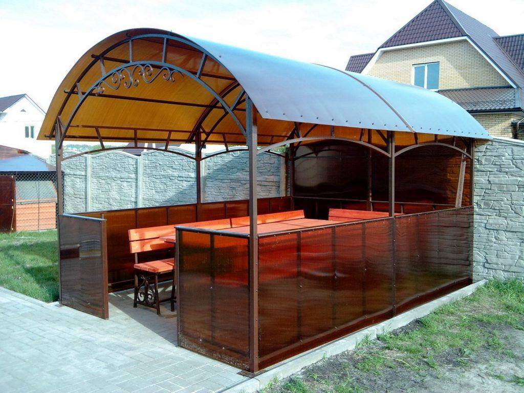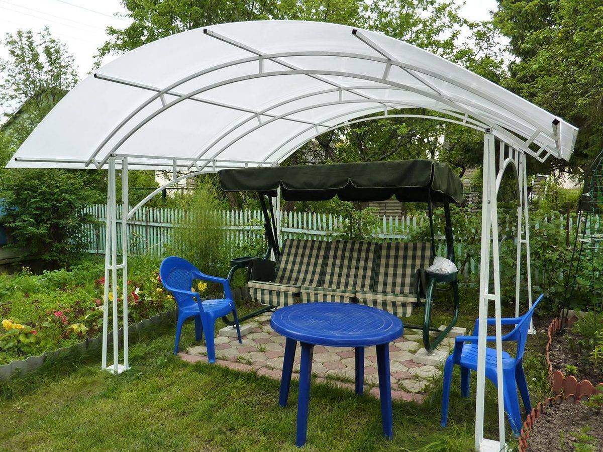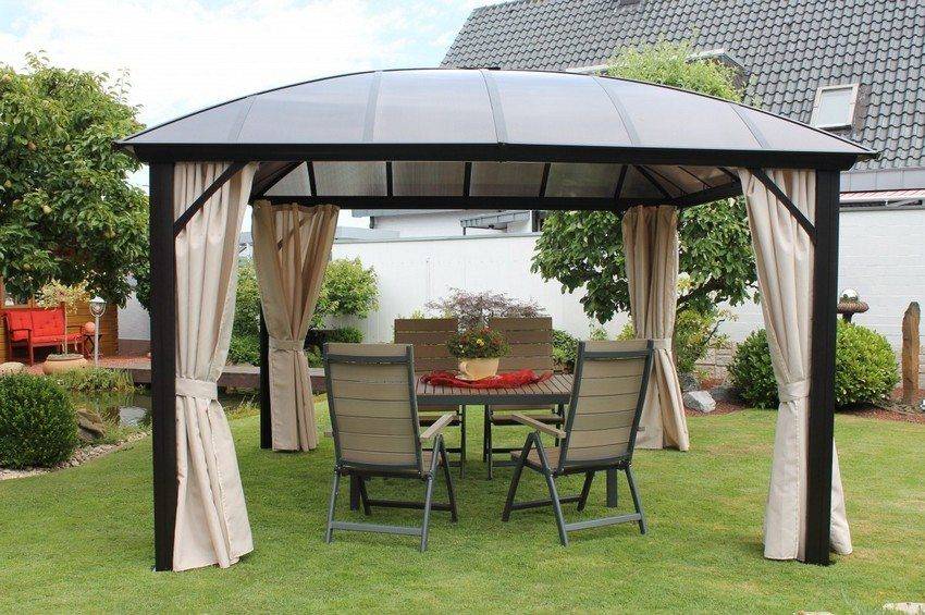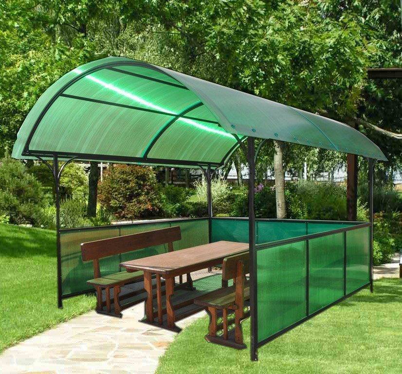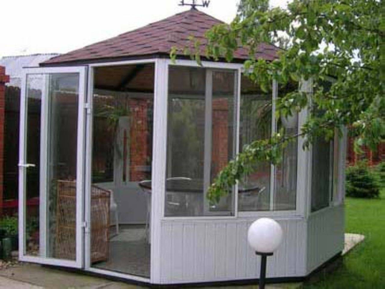 Пластик, армированный алюминиевым профилем, также используется для создания беседок. Внешне конструкция напоминает современные пластиковые окна и балконы, ее сложнее органично вписать в природный ландшафт, но и плюсы у таких беседок есть: