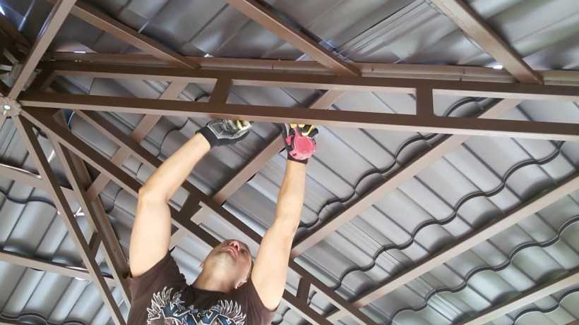 Затем обшивают каркас кровли доской или фанерой, и уже готовую конструкцию поднимают и монтируют к опорным стойкам беседки.