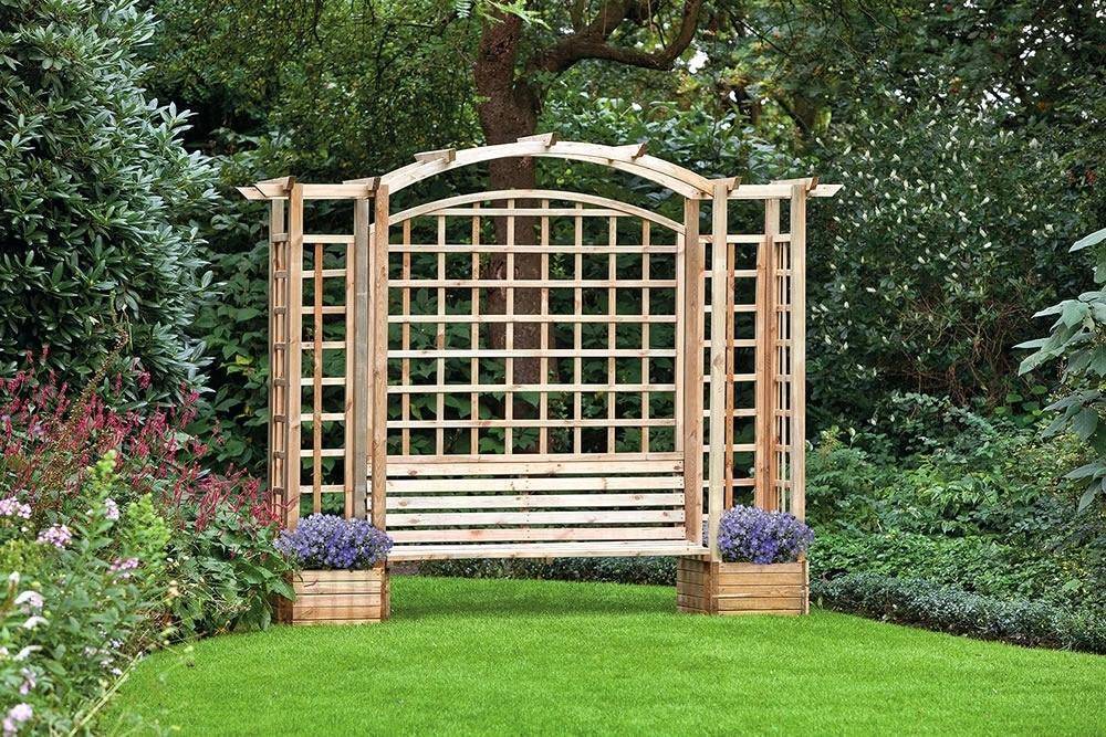 Деревянная беседка идеально вписывается в сад. Интересным решением будет порыть крушу лозой. Материал изготовления может быть сосной, пропитанной вручную цветом палисандра. Беседка может быть изготовлена по оригинальному дизайну владельцев сада. Можно использовать готовые, пропитанные элементы для строительства.