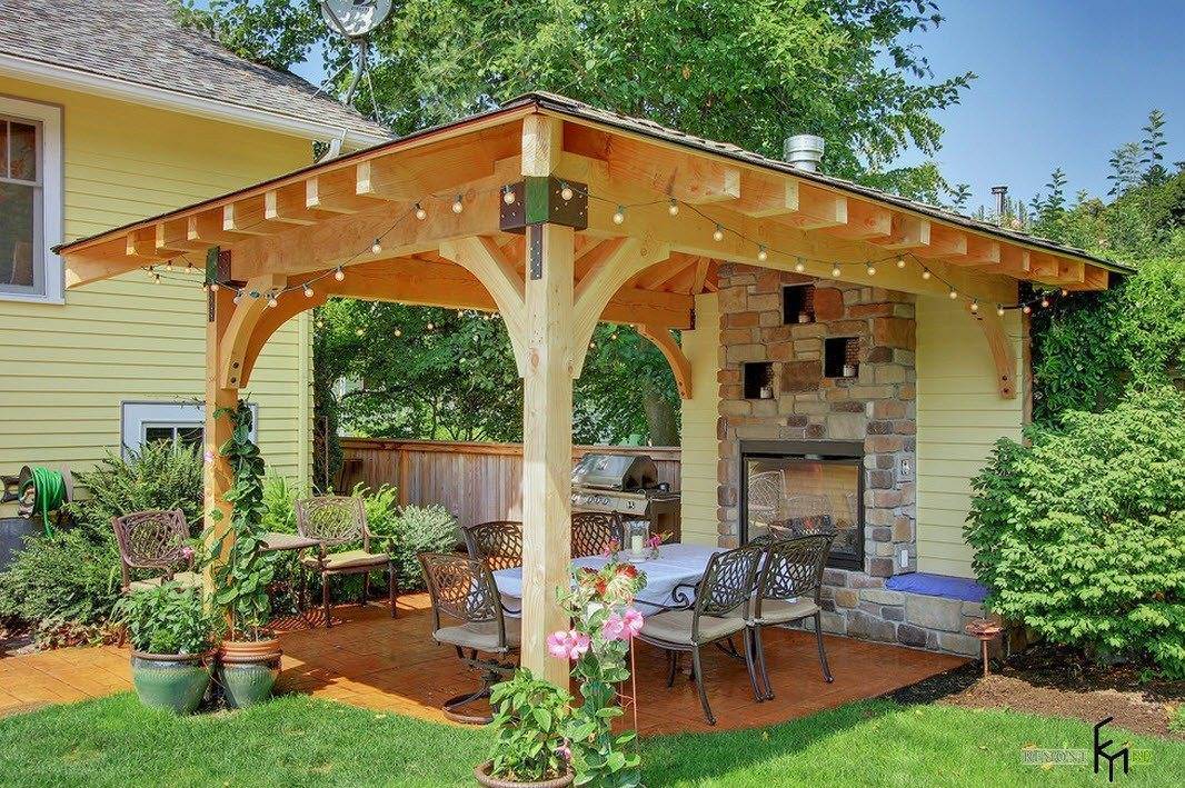Беседки-навесы из дерева с печью выглядят очень уютно. Сочетание древесины и камня – это главная особенность рустикального стиля. Натуральные грубые материалы очень гармонично смотрятся вместе.