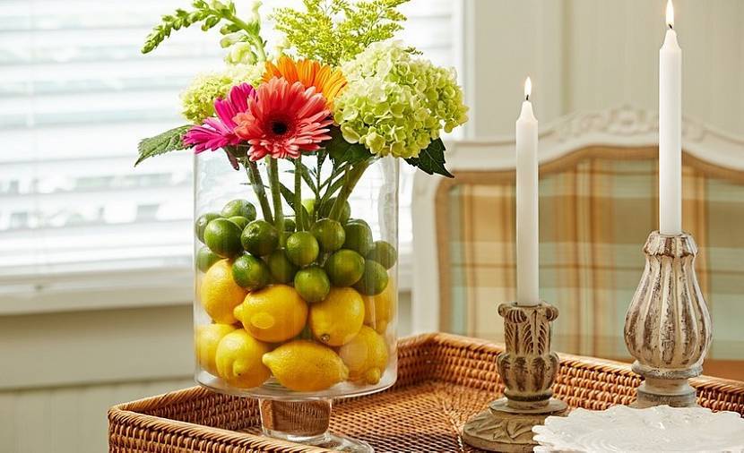 Если такой букет выглядит слишком просто и банально, можно вместо вазы взять прозрачный сосуд, наполнить его лимонами и водой, в него поставить цветы. Воду можно окрасить в разные цвета с помощью пищевых красителей. Можно вставить эту композицию в плетеную корзину, повесить на стену.