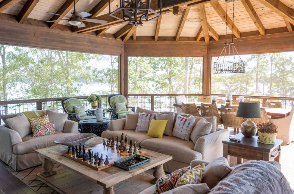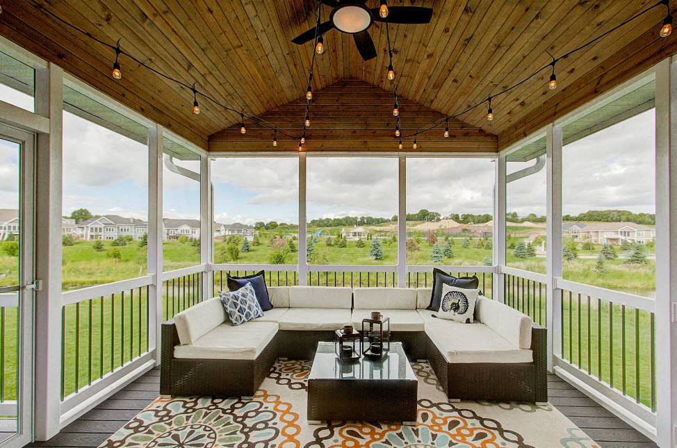 Однако недостаточно просто пристроить такой объект. Его нужно наполнить всем необходимым. Удачным сочетанием будет мягкая мебель, уже защищенная от внешних факторов, и ковровое покрытие, по которому гораздо удобнее ходить.
