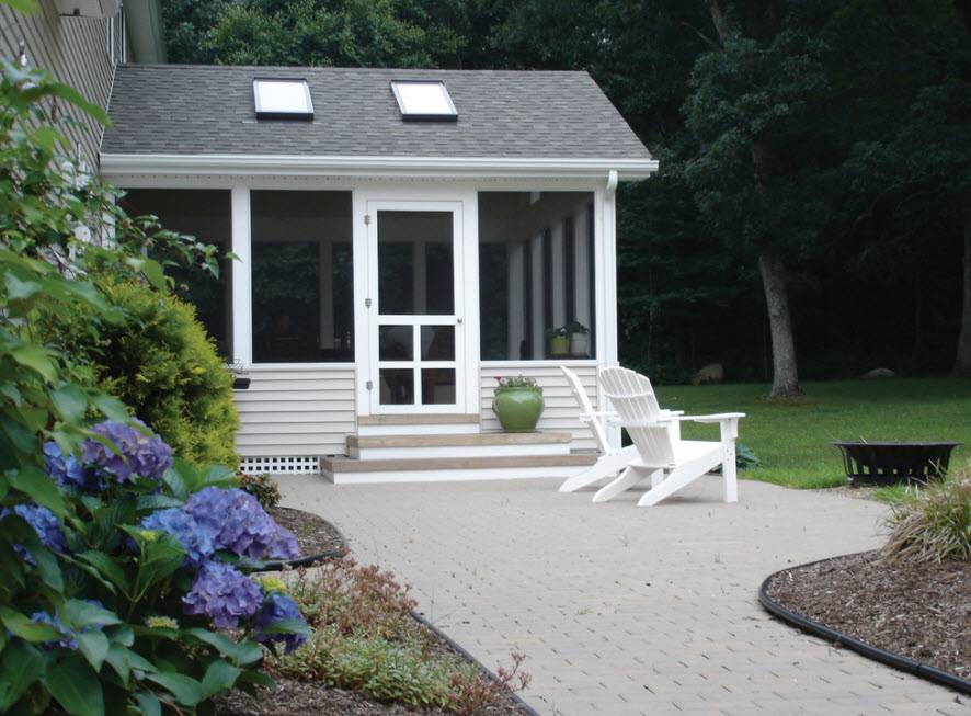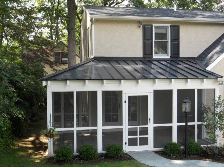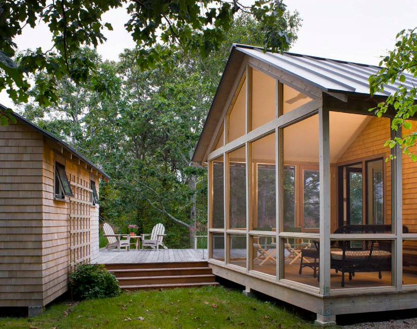 Несмотря на то что стены в таком помещении необязательны, их можно заменить легкими решетчатыми полотнами или установить резные перила. Актуальными будут также невысокие стены с открытым верхом, заменяющим окна или даже откидные ставни на их месте, позволяющие сделать реальным времяпрепровождение в пристройке зимой и летом.