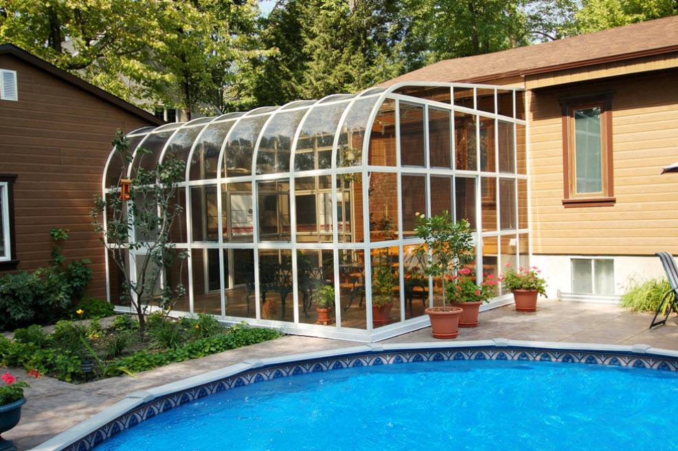 - обшивка поликарбонатом – считается конструкцией эконом класса, но может выглядеть очень привлекательно, легко разбирается и собирается.