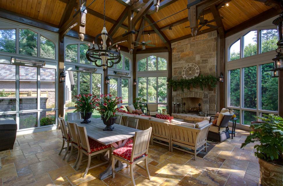 Не стоит забывать о том, какой климат свойственен региону. Если суровые зимы не редкость, то стоит исключить вариант с полностью застекленной верандой. В противном случае потребуется предусмотреть систему внутреннего отопления на этом участке, установить утеплитель под кровлю, сделать полноценный потолок, а также герметизировать все швы и установить высококачественные стеклопакеты. Таким образом, нагрузка на каркас увеличится и его придется усиливать, чтобы ее распределить, однако, в результате у вас будет теплая веранда у дома.