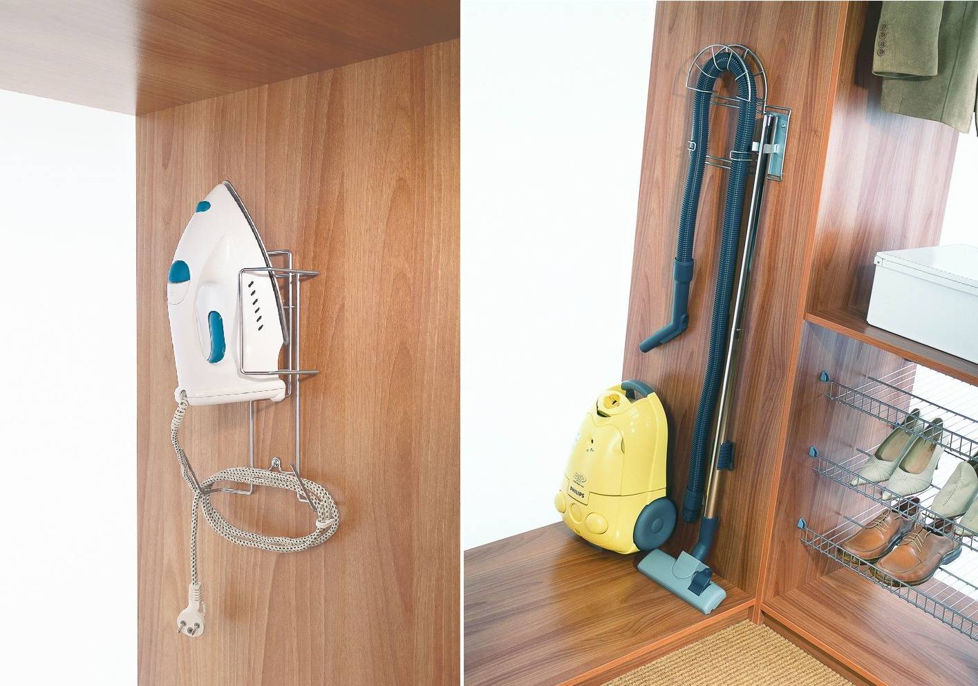 Если размеры хранилища позволяют, то в нем можно предусмотреть отсек для хранения гладильной доски. В этом случае нужно знать габариты самой доски. Специалисты рекомендуют устраивать ширину отсека не менее 0,2 м по ширине. Есть и встроенные в гардеробном шкафу гладильные доски, которые легко откидываются.