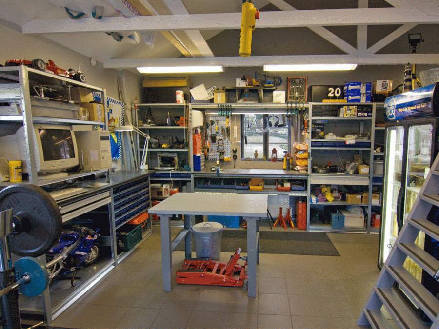 Верхний свет, создающий общее освещение, установлен в подвесной потолок белого цвета. Однако в этом случае его несколько ослабляют обустроенные по всему периметру помещения полки. Они удобны для хранения различных полезных в гараже вещей и инструментов, но дают довольно глубокие тени в пристенных областях, где обычно размещаются рабочие верстаки.