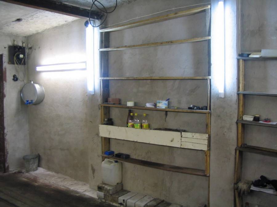Вдоль дальней стены помещения как раз и установлен стол, предназначенный для выполнения работ. Однако, локальное освещение этой области совсем не предусмотрено. Возможно, владелец гаража планирует установить или же подвесить переносной осветительный прибор, так как рядом со столом установлена розетка.