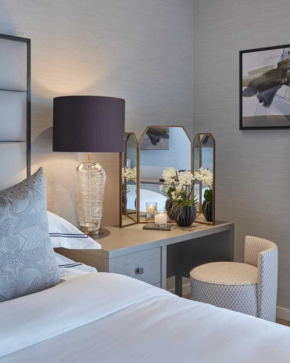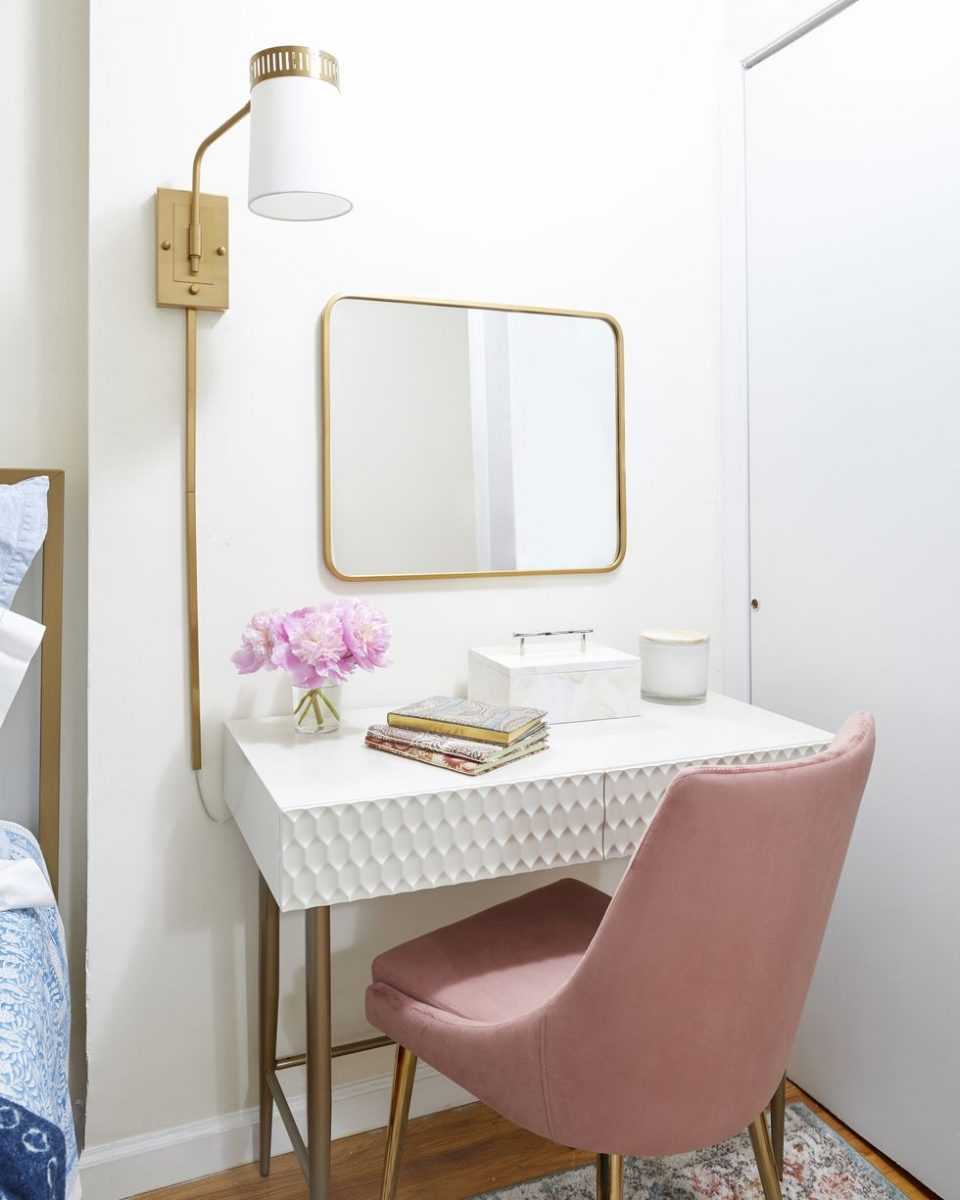 Установленный туалетный столик также рекомендуется подсветить, ведь естественное освещение не всегда доступно. Приборы с мягким светом без теней и контрастов должны располагаться с двух сторон от зеркала на уровне глаз. Чтобы не искажался цвет лица, следует выбирать белые плафоны.