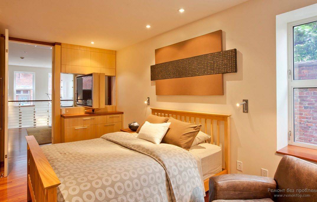 Чаще всего от люстры отказываются, когда спальная комната имеет небольшие размеры и оснащена низкими потолками. В таком случае выходом из затруднительного положения будут светильники, которые закрепляются на стене, или же точечное освещение.