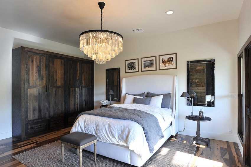Геометрический центр помещения считается наиболее правильным местом расположения люстры. Наилучшим вариантом для спальни является непрямой рассеянный свет, который не бьет в глаза.
