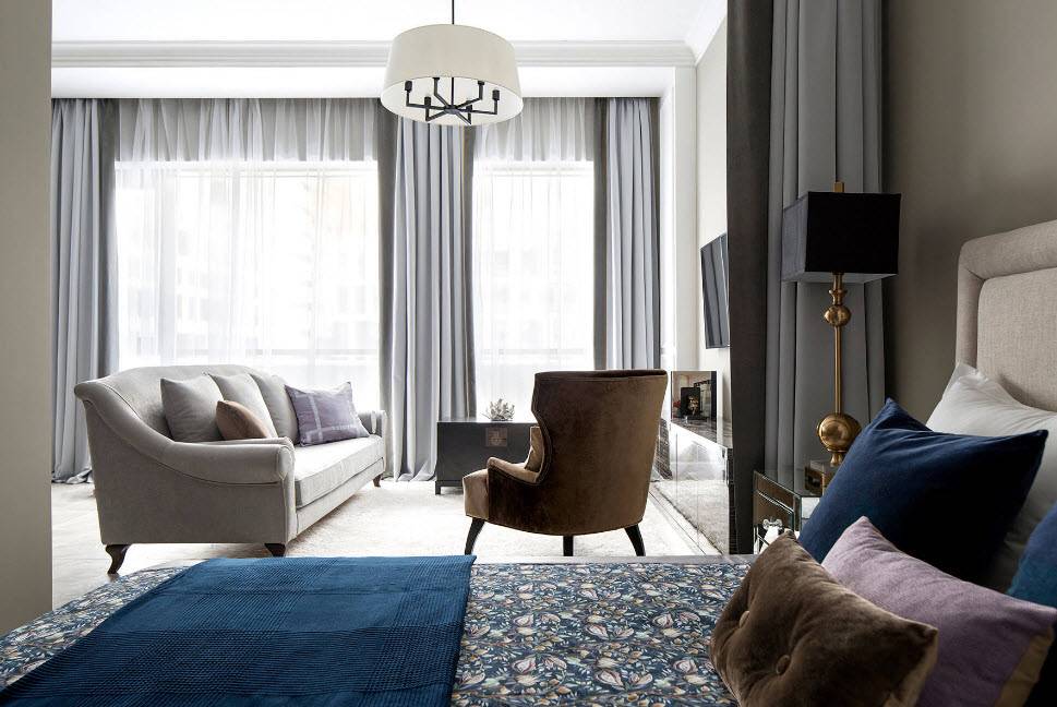В современном стиле. Дизайн выполняется в ненавязчивой, бежевой, серой или песочно-белой гамме. Выбирается мебель простых форм без дополнительного декора. Увеличить пространство помогут зеркала, полированные поверхности, открытые полки, текстиль без крупных принтов. Важен выбор освещения — понадобятся прикроватные лампы или бра, возможно, точечное светодиодное освещение.