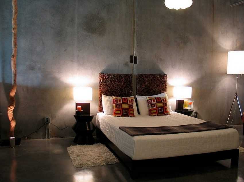 На фото локальное освещение спальни в стиле лофт представлено настольными лампами и торшером.