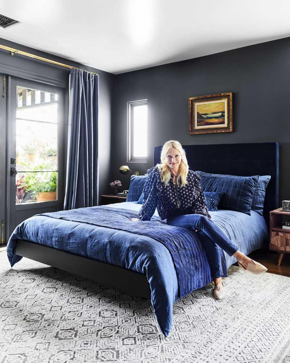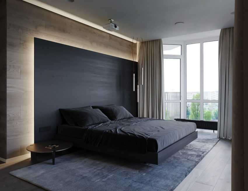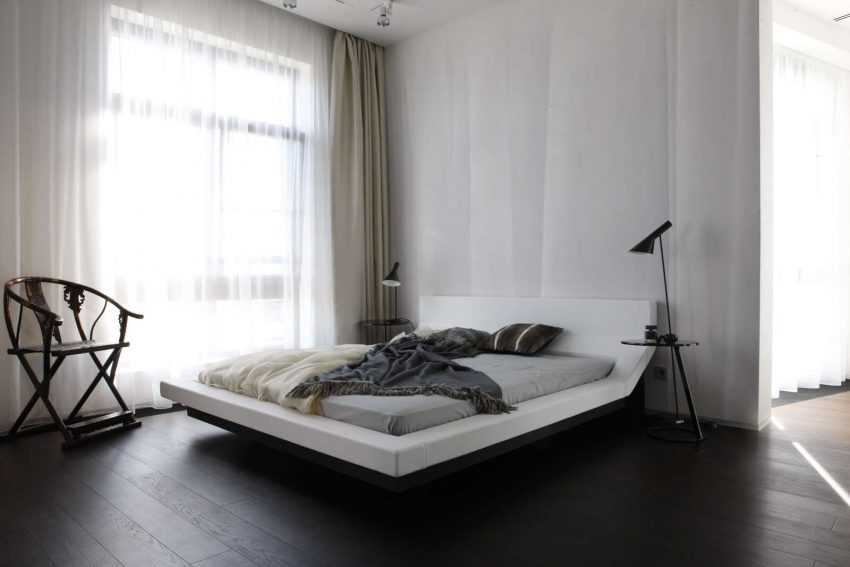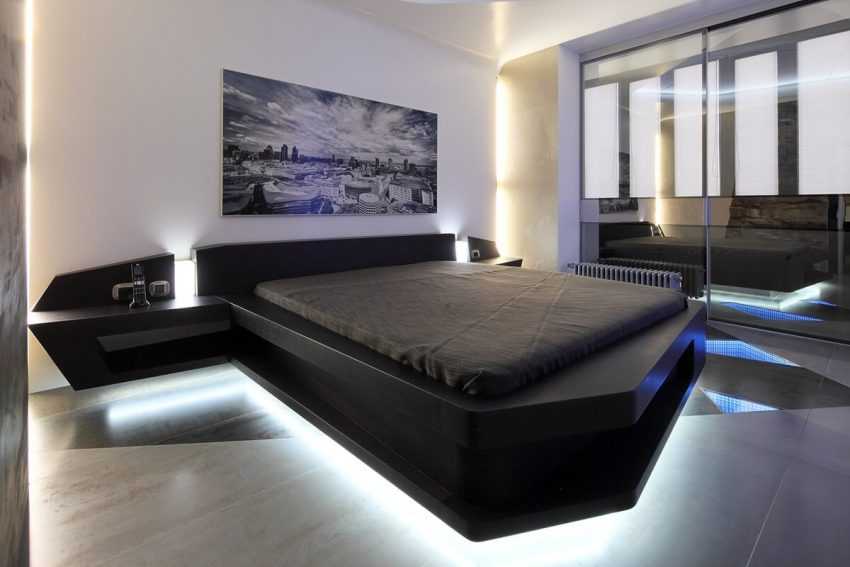 - Пол, выделив кровать и создав эффект “парящей” конструкции.