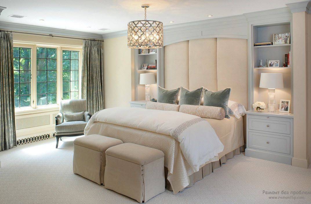 Наиболее распространенный вид светильников – люстры. Размещаются по центру комнаты. Следует выбирать изделия с абажурами, что создать рассеянное освещение для спальной комнаты. При этом одного такого светильника будет явно недостаточно, если вы планируете работать или читать в комнате.