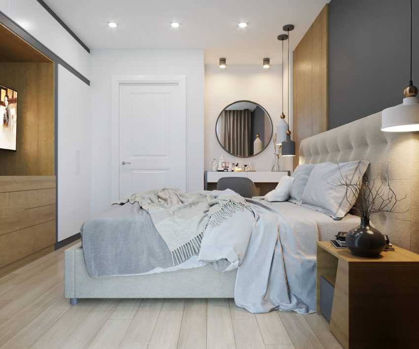 - В спальне общий свет должен быть рассеянным, создавать атмосферу уюта и расслабленности. Туалетный столик и прикроватные тумбочки оборудуют настенными спотами.