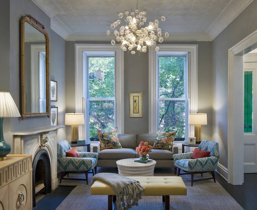 - Чтобы освещение было более интенсивным, потолок гостиной должен быть хорошо освещен. Этот фактор поможет визуально расширить пространство помещения. Поэтому если дизайном предусмотрена одна люстра, которая должна стать центром композиции, то ее рекомендуется дополнить точечными светильниками.