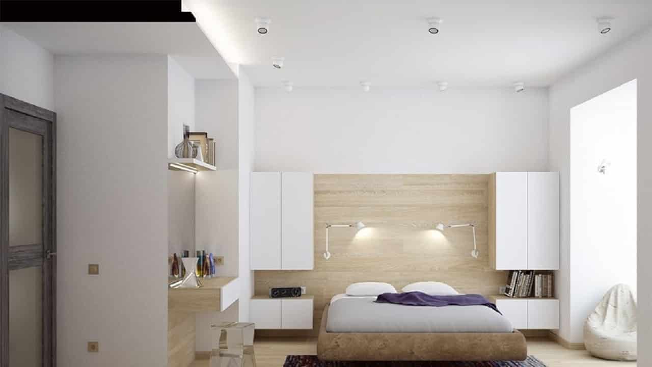 - Освещение в спальной комнате организовывается по тому же принципу, что и в гостиной. Рабочее освещение должно быть установлено у изголовья кровати. Но свет в этом помещении не должен быть ярким, иначе он не будет способствовать полноценному отдыху.