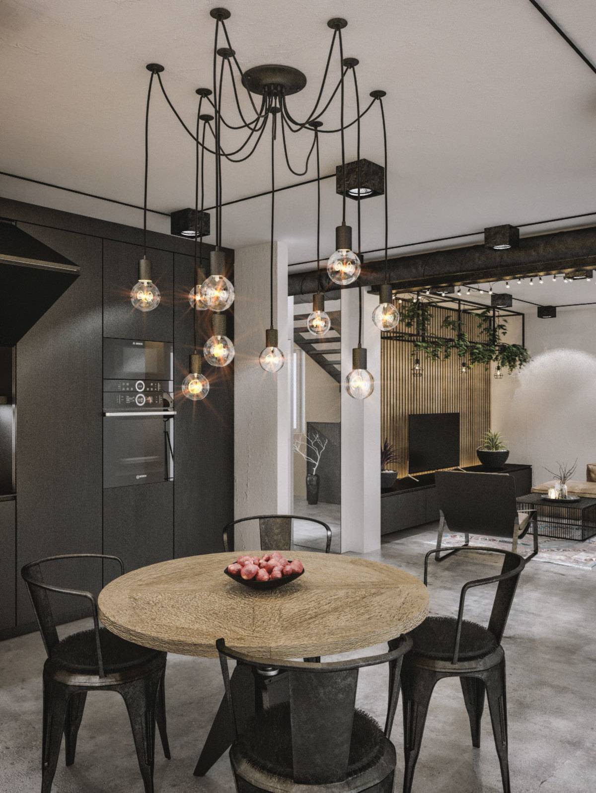 Важно! В интерьере кухни лофт недопустимы люстры с текстильными или цветными абажурами, наличием декоративных подвесок или других украшений