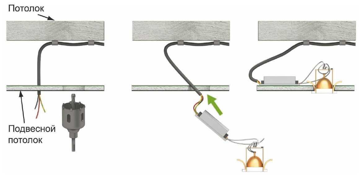 Точечные светильники обычно устанавливают с подвесными или натяжными потолками. Если потолки натяжные, все провода укладывают заранее. Их крепят к потолку, не подключая к питанию, размещают и закрепляют на подвесах светильники, затем подключают к ним провода и проверяют работу.