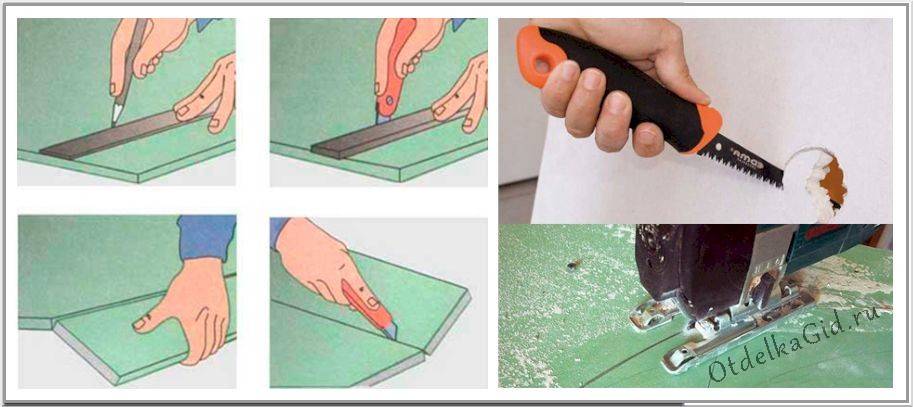 Раскрой листа по прямой выполняется при помощи металлической линейки и строительного ножа, сложные линии вырезаются ножовкой по гипсокартону или электролобзиком