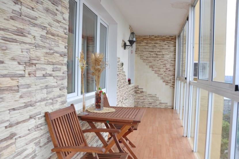 Полная отделка стен. При желании балкон или лоджию можно целиком отделать декоративным камнем. Основное правило касается размаха работ: чем больше площадь облицовки, тем более светлый цвет выбирают. На холодном (открытом, без утепления) балконе обычно облицовывают стену, сопряжённую с комнатой. На утеплённом балконе отделка может быть полной или частичной.