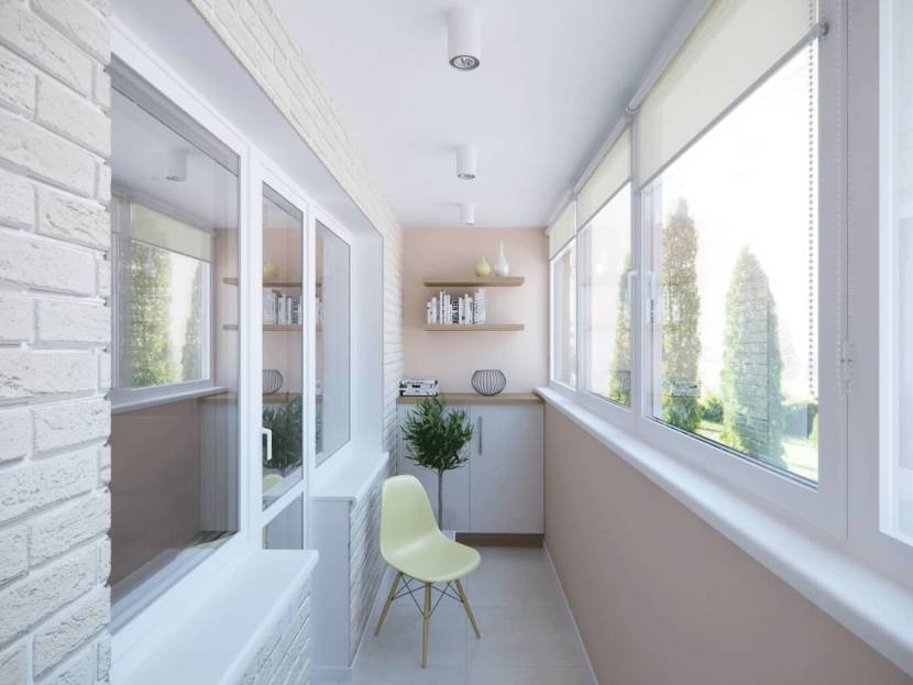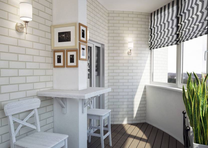 На фото просторный балкон, декорированный белым кирпичом. Благодаря частичной облицовке пространство не выглядит перегруженным.
