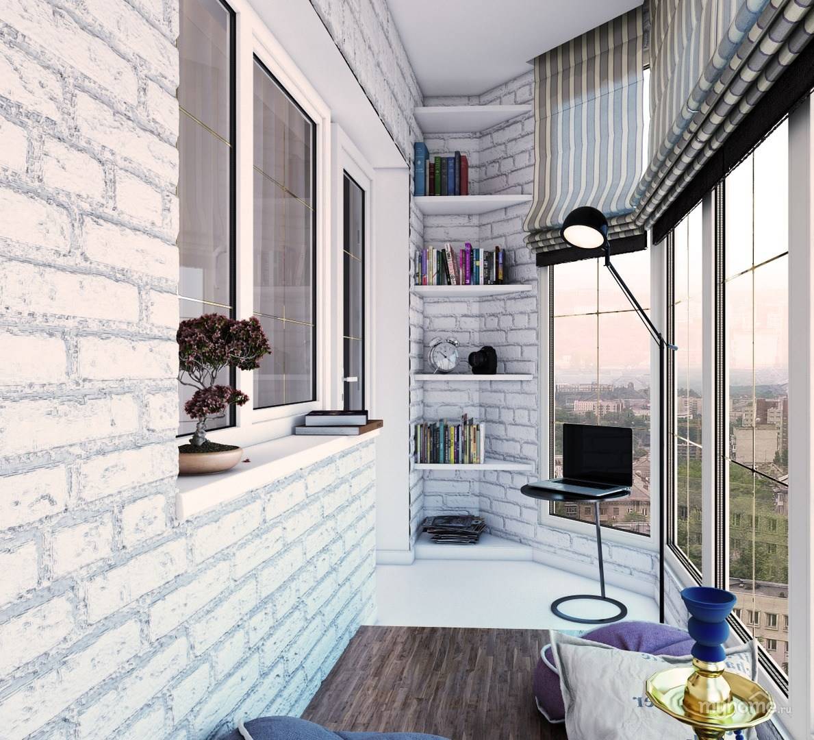 Интерьер утепленного балкона оформляют теми же отделками, что и комнату. Уместна сухая штукатурка или ее имитация. Допускаются нестандартные решения: